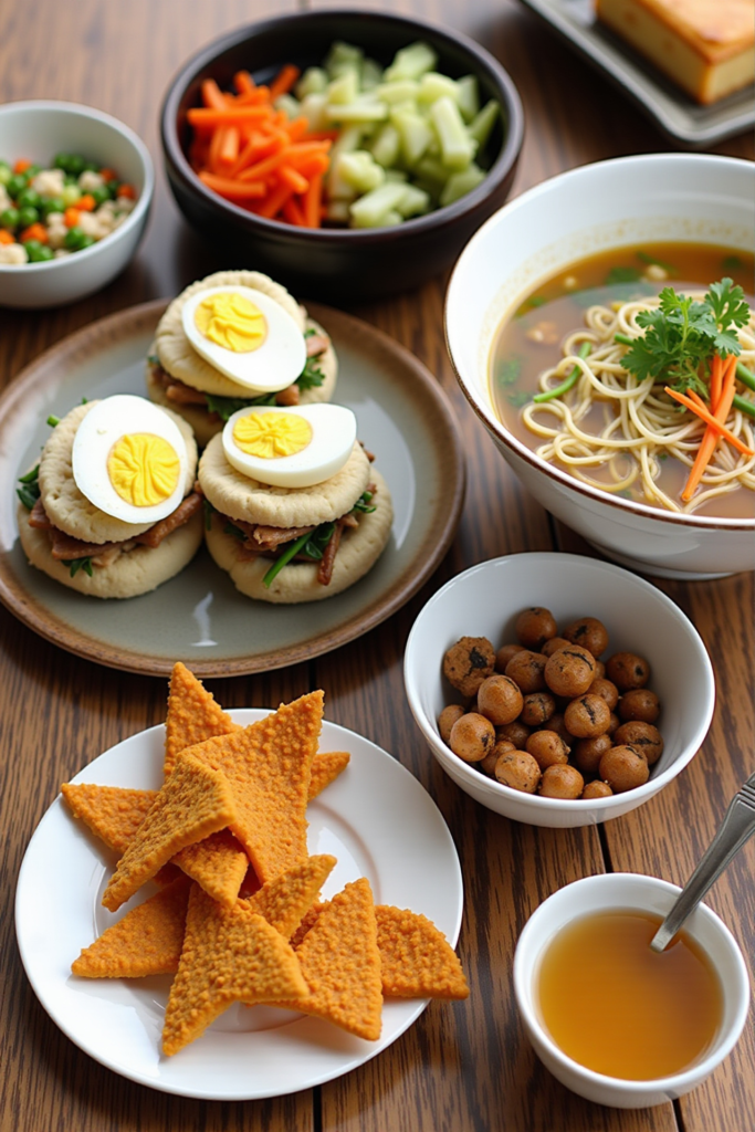 – Korean Savory Pancakes (Pajeon): Crispy pancakes packed with green onion, seafood, or kimchi, perfect with a dipping sauce.