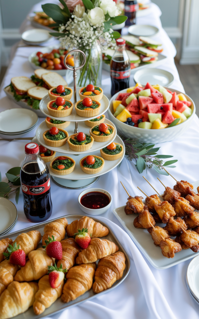 - Breakfast Pastries & Breads: Mini croissants, English muffins, bagels, and scones. Arrange pastries on napkin-lined trays or baskets for a rustic, inviting look.